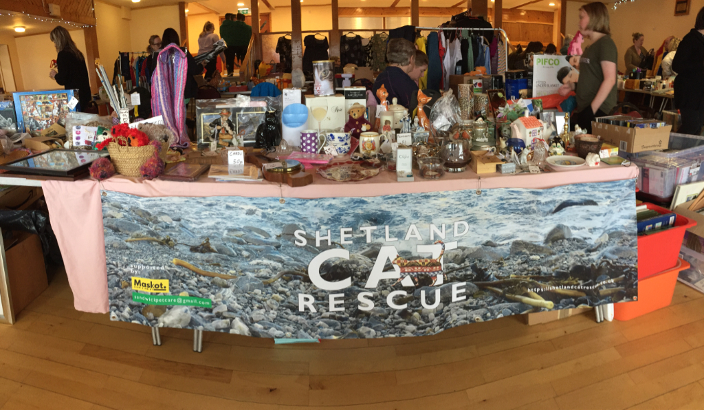 At Shetland Cat Rescue we prefer talking to people face-to-face, which is one of the reasons we have our regular fundraising stalls. This week we added a new dimension to that, thanks to the generosity of Sandwick Pet Care and Maskot, who have provided us with a bright and eye-catching banner.