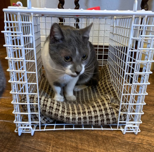 It is good to make (or purchase) a cover for the carrier, to help the cat feel secure and safe. You can knit, sew or crochet them or just put a blanket or towel over.