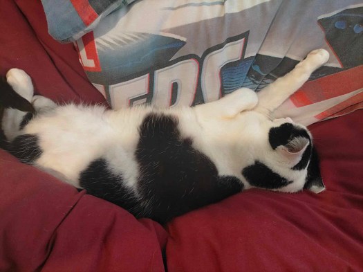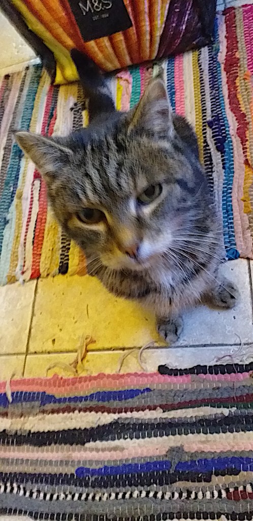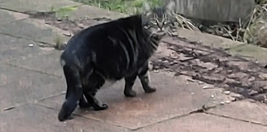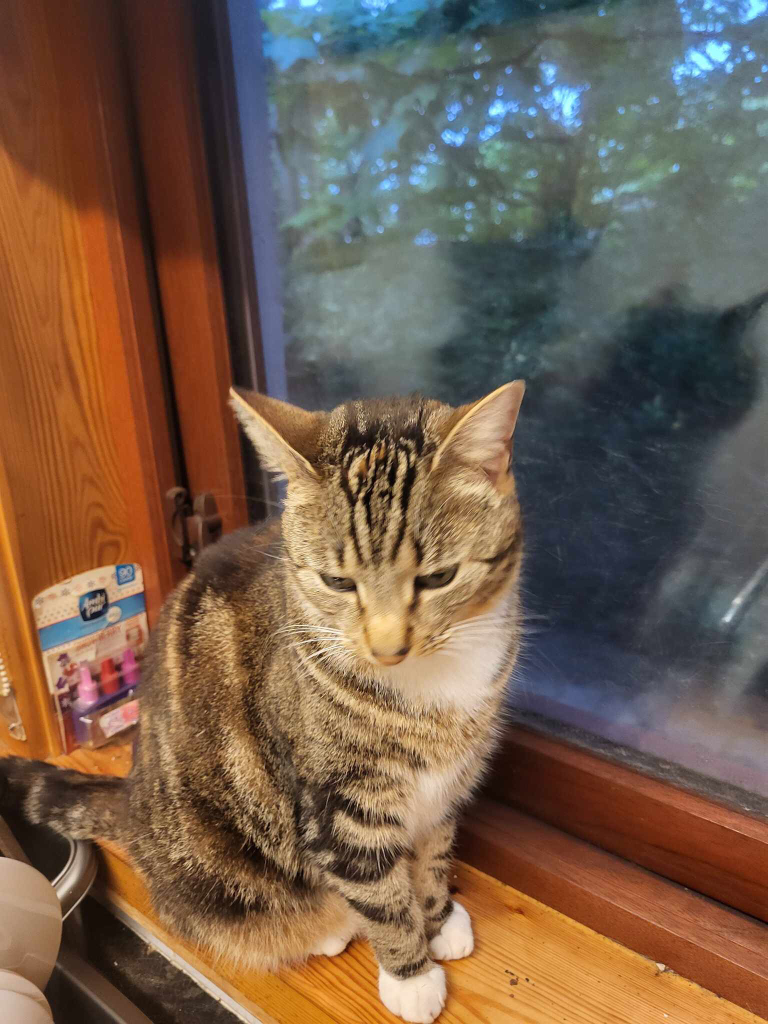 He knows all about cat flaps, having gone into the house of the person who told us about him and whose own cats were not impressed, so probably had an owner recently. However, he is easily scared if approached, though not terrified.